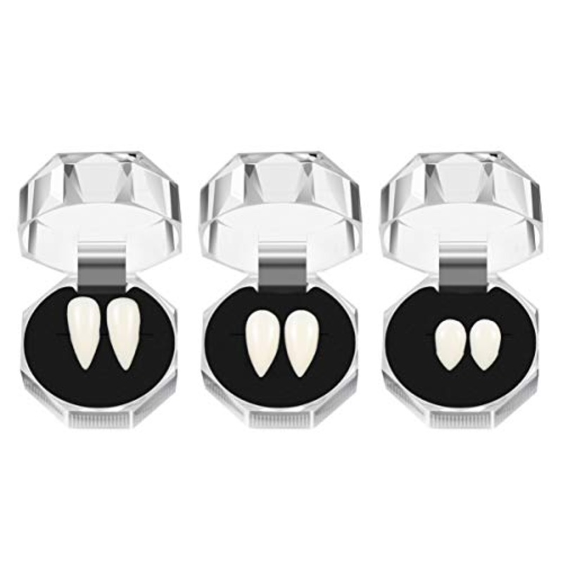 Dettagli: DescrizioneOgni cappuccio di zanna diviso in due punte. Possono adattarsi a canini e /o incisivi o denti inferiori. Veloce, facile, comodo e totalmente realistico. I cappucci per zanne di colore naturale sono lucidi, rigidi e magnificamente sagomati per un bell’aspetto in ogni bocca. Scherzi di Halloween perfetti e regalo bavaglio.Caratteristiche- Colore: bianco.- Dimensioni: 13mm, 15mm, 17mm.- Materiale: resina.- Realizzato in resina medicinale, senza alcun danno, sicuro, addensato e insapore. Risciacquare abbondantemente prima dell’uso.- 3 coppie di protesi da vampiro di cui 13 mm, 15 mm e 17 mm, ciascuna coppia viene fornita con scatola trasparente, senza colla o adesivo per protesi.- Denti da vampiro per unisex su oggetti di scena del custume di Halloween come vampiri, lupi mannari e altre creature della notte.- Ideale per qualsiasi cosplay. Perfetto per la festa in costume di Halloween.- Indossa queste zanne di vampiri e crea subito una festa di Halloween horror, credendo che i tuoi ospiti e amici saranno molto felici.Pacchetto compreso3 coppie x Halloween Vampire Teeth