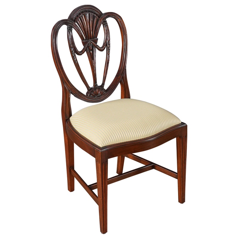 A Solid Mahogany Clover Back Side Chair as interpreted by Niagara Furniture. These chairs are a fine quality, heart shaped chair with an elegant and stylish back featuring Drape Carvings as well as interconnected loops crested by a pierced and carved back splat. Reminiscent of antique chairs produced from the late 1700s onwards these. Clover Back Side Chairs will never go out of style. Constructed from solid mahogany throughout the Clover Back Side Chair also features tapered reeded legs on the front of the chair which are connected with cross stretchers to the rear legs for extra stability and longevity. The drop in seat measures 21 inches high and can be reupholstered easily by simply removing the seat by unfastening four screws and recovering the existing fabric.