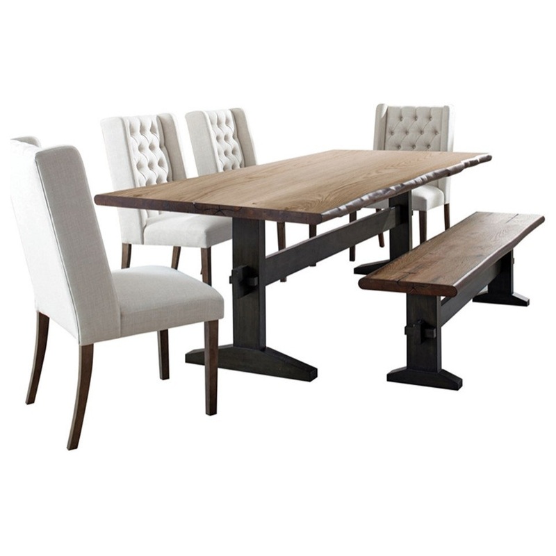 Complement your farmhouse style dining area with this rustic and traditional style dining room set. This dining set comes with a rectangular table with a trestle style base, while live edge detailing delivers rustic, purposely unfinished appeal and an opti