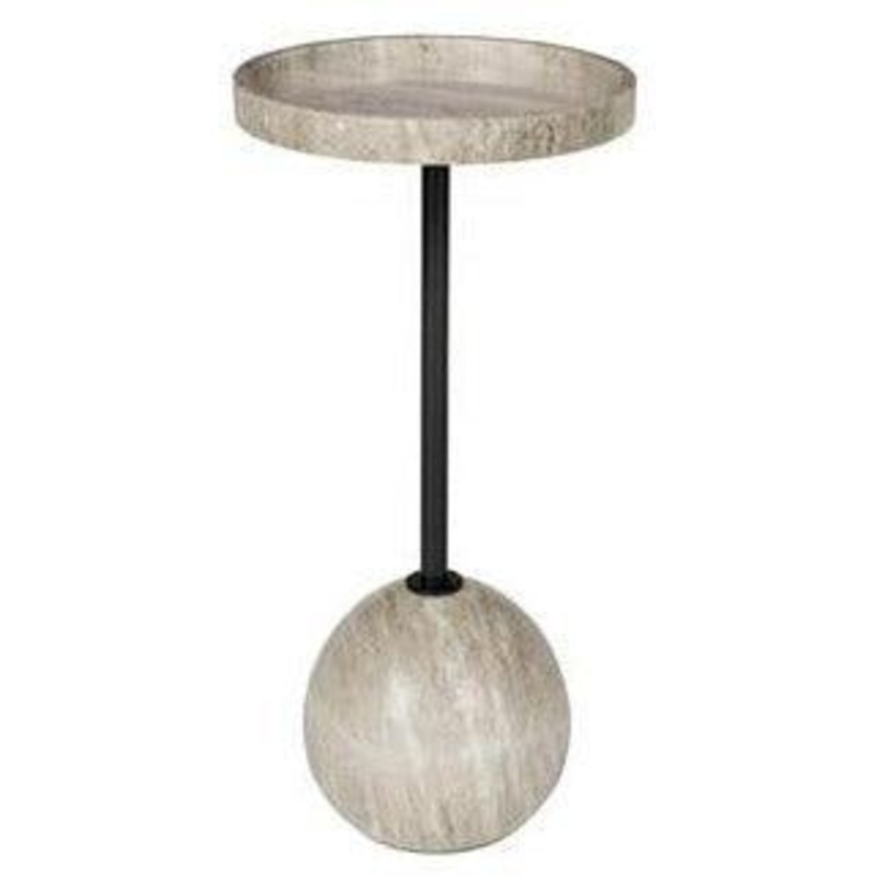 A barna mrvny teteje osztlyossgot s luxust sugroz, mg a kerek goly alak talp jtkos rintst ad. Az asztallap krl emelt szl stabilan tartja az italos poharakat, s a kzpen elhelyezked fekete vasoszlop biztostja a tmasztkot.