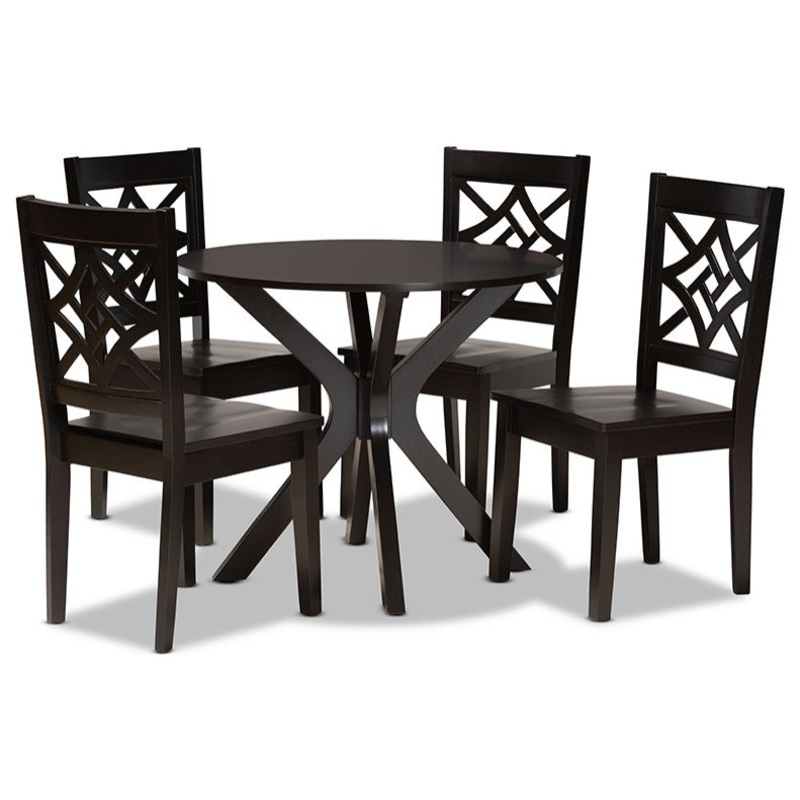 Add crisp, contemporary design to your dining space with the visually striking Colton dining set. Made in Malaysia, this wooden set includes four dining chairs and one dining table finished in a rich dark brown. Each chair is fitted with a smooth scoop seat for casual comfort and features a unique, geometric cut out design for enhanced visual appeal. Requiring assembly, the circular tabletop provides ample elbow room for each member of the table. Perfect for both casual and formal dining, the Colton dining set is an excellent addition to the modern home.