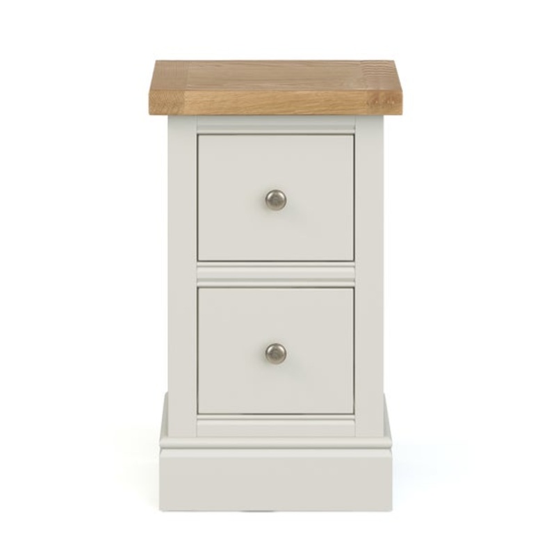Who said luxury and style cant be affordable? Our Compton Slim bedside fits the bill! The antique silver round handles paired with the ivory painted finish and contrasting oak veneer top will breathe a new lease of life into a country inspired home. The chunky farmhouse style has been compacted into a slim bedside perfect for smaller spaces. With no assembly needed, all thats left is to style your bedside with your favourite dcor pieces and a lamp to finish it off.