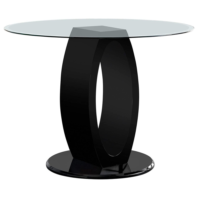 -Includes: One 1 Counter Height Dining Table; Comes with assembly instructions -Contemporary style; Round 10mm tempered glass top with beveled edges -Materials: Tempered Glass, Wood -Features: O-shaped leg design atop a pedestal base -Dimensions: 36 inches