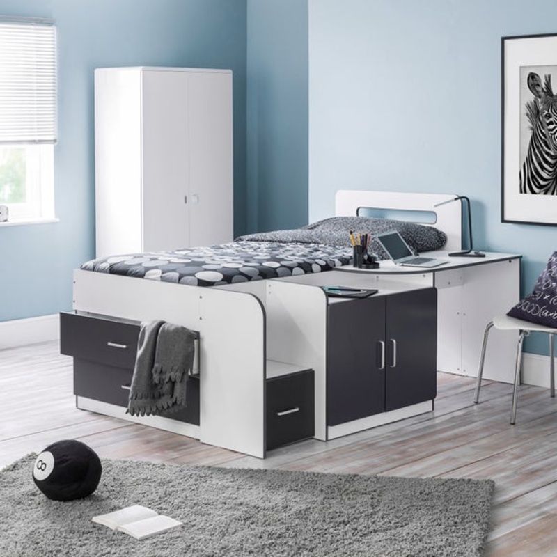 Robust wooden frame with a matte finishSolid slatted base- allows air to be circulated around your mattressFeatures 3 drawers, 1 cupboard, 1 shelf, and a deskAn innovative and highly functional cabin bed, the Cookie Cabin Bed offers incredible versatility