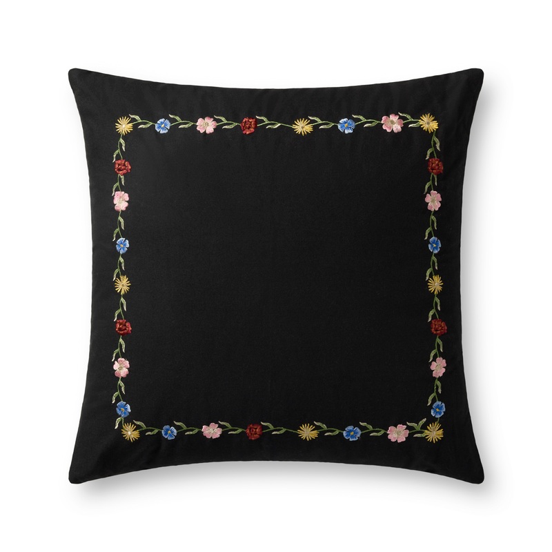 This elegant black throw pillow from Rifle Paper Co. x Loloi features an embroidered, colorful floral frame based on original artwork by Anna Bond. The 22 x 22 square pillow is machine-embroidered in India of 100% cotton.