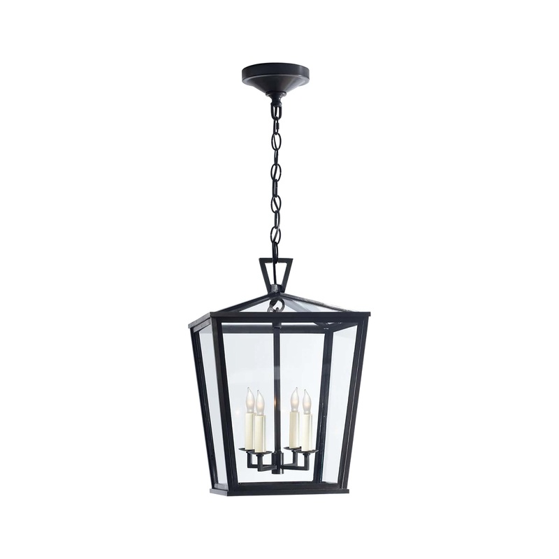 The Darlana Small Hanging Lantern adds a comforting lightto elevate any of your outdoor spaces. The Darlana lantern features a durable bronze-finished metal frame with clear glass panels and four interior candle lights. Boasting a design inspired by classic street oil lamps, this piece has the versatility to complement both traditional and contemporary decor styles. The DarlanaSmall Hanging Lantern is part of the Chapman & Myers collection.