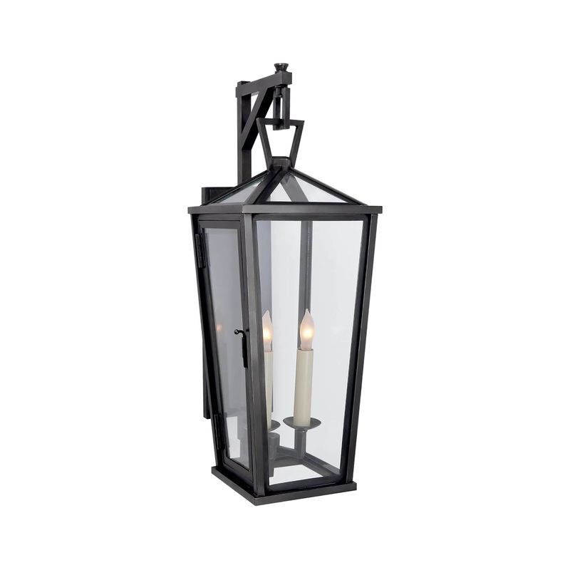 The Darlana Small Tall Bracketed Wall Lantern sports timeless style, with geometric motifs and mixed materials. This lantern features a sturdy metal frame with a stately bronze finish, accented by clear glass panels. Two candelabra-style lights give this piece a dash of historical intrigue, while the bracket mount lends elegance and versatility to this impressive fixture. The DarlanaSmall TallBracketedWall Lantern is part of the Chapman & Myers collection.