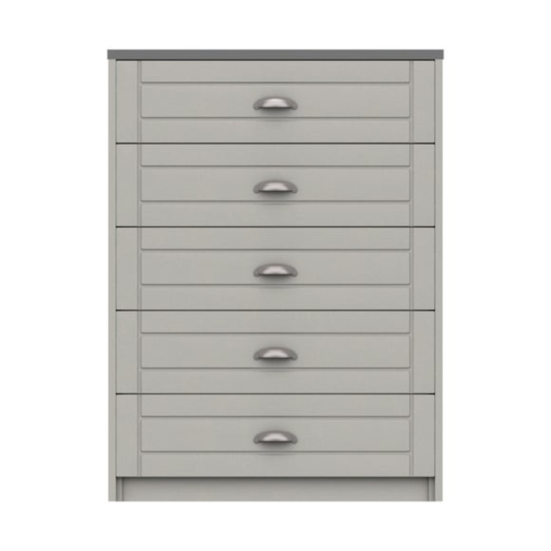The Darwin five drawer chest table boasts a timeless design that would suit any space. This chest of drawers features a distinctive routed drawer style, complete with stylish metal cup handles and linen-look drawer liners.