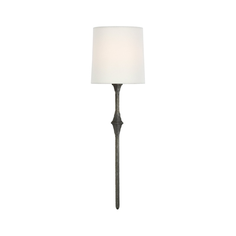 The Dauphine Sconce offers a stunning blend of rugged and decorative styling, molding metal into a subtle geometric form with tapered accents and prominent lines.This fixture’s body is topped with a natural paper shade, which diffuses light for a warm ambience that brings depth and personality to your living space. Boasting an air of old-world charm, this sconce’s elongated form and shape brings a modern edge to the piece. The Dauphine Sconce is part of theStudio VC collection.