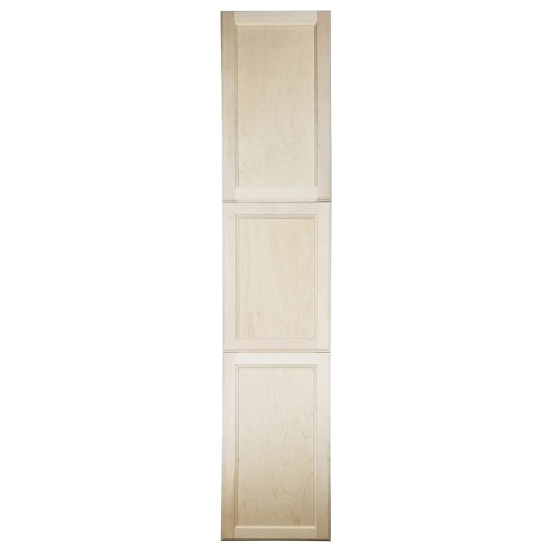 Perfect for any bathroom. Recesses in the wall between the studs, and simply screws to the studs on each side of the opening. Only the doors are outside the wall. Fully adjustable glass shelves inside. Our unique, patented design of shelf supports keeps each shelf in place. Concealed hinges with soft close built in assures the door will never slam shut, but softly close on its own instead. Box is SOLID pine and the Inset panel style door is SOLID maple. We’ve painted the inside of the box white, so you don’t have to! Unfinished doors can be painted or stained. The box is 3.5″ deep inside and gives you plenty of usable depth, but fits in standard 2×4 walls. This model has THREE doors which open to reveal two separate cabinet sections. Cabinet box is 12.5″ wide inside. Doors are reversible to open either Left or Right. Completely assembled! All you need to do is put one screw in each hinge to mount the door. Then insert it in the wall and screw it to the studs with included screws. If you are replacing a current cabinet, measure your wall opening! White plastic trim surround covers the rough edges of your opening up to 1/2″ all around. Doors cover the trim surround when closed so the only thing you see outside the wall is the door itself. Made in USA.