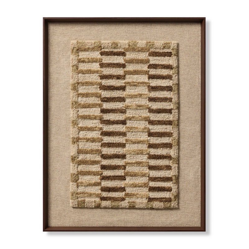 Ready-to-hang Descanso wall art from Amber Lewis x Loloi features a hand-tufted wool textile with a broken stripe pattern in an earth-toned palette, measuring 42 x 32. The artwork is made in India and custom-framed in Dallas, Texas.