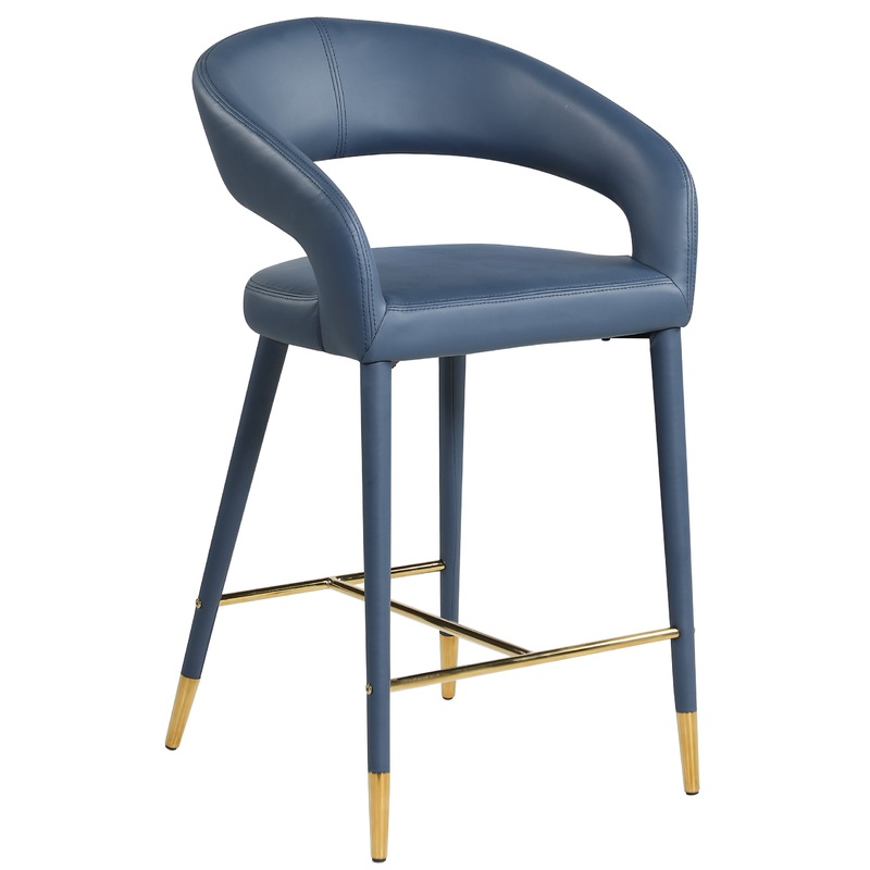 Settle in for a meal with friends seated in this Destiny vegan leather stool. Soft navy vegan leather upholstery makes this stool a sleek and inviting option for pairing with your favorite counter table. The rounded back adds comfort to mealtime and lends the stool a chic, eye-grabbing touch, while tapered legs topped with gold tips give the stool an elegant finish.