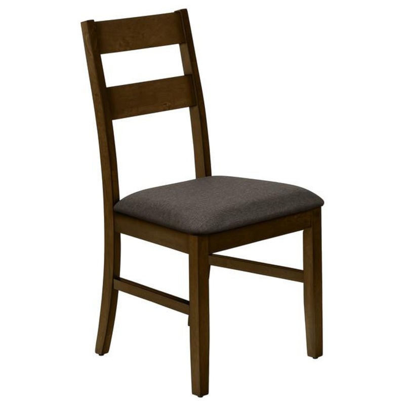 Take your dining space to the next level with this fashionable and comfortable set of 2 dining chairs in a warm brown walnut finish. Featuring a transitional design these 37 high ladder-back side chairs combine a classic look with contemporary elements to create a stylish addition to your kitchen or dining room. These chairs are constructed with a solid wood frame to be sturdy and reliable and the upholstered brown fabric seat with foam cushioning adds a soft touch of comfort. Quick and easy to assemble these chairs include full illustrated instructions so you can have these setup and ready to use in time for your next meal. Each chair comes with a 2 year limited warranty against manufacturer’s defects for your peace of mind. Pair these chairs with a matching dining table sold separately for timeless style and comfort in your formal or casual dining room.