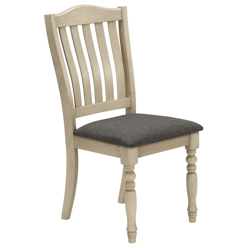 Welcome some fashion-forward dining with this set of 2 dining chairs in an elegant antique grey finish. With their chic; transitional style; these 2 upholstered chairs will fit perfectly in any formal or casual dining room or kitchen. The firm padding and linen-look grey fabric will bring comfort and warmth; while the antique grey solid wood legs with turn post front legs add a fashionable flair. These chairs are easy to assemble and have a durable; sturdy construction that will last you for years to come. These armless side chairs come with a 2 year limited warranty against manufacturer s defects ensuring you are purchasing a quality made product. Pair these chairs with the matching dining table (sold separately) for a complete ensemble.