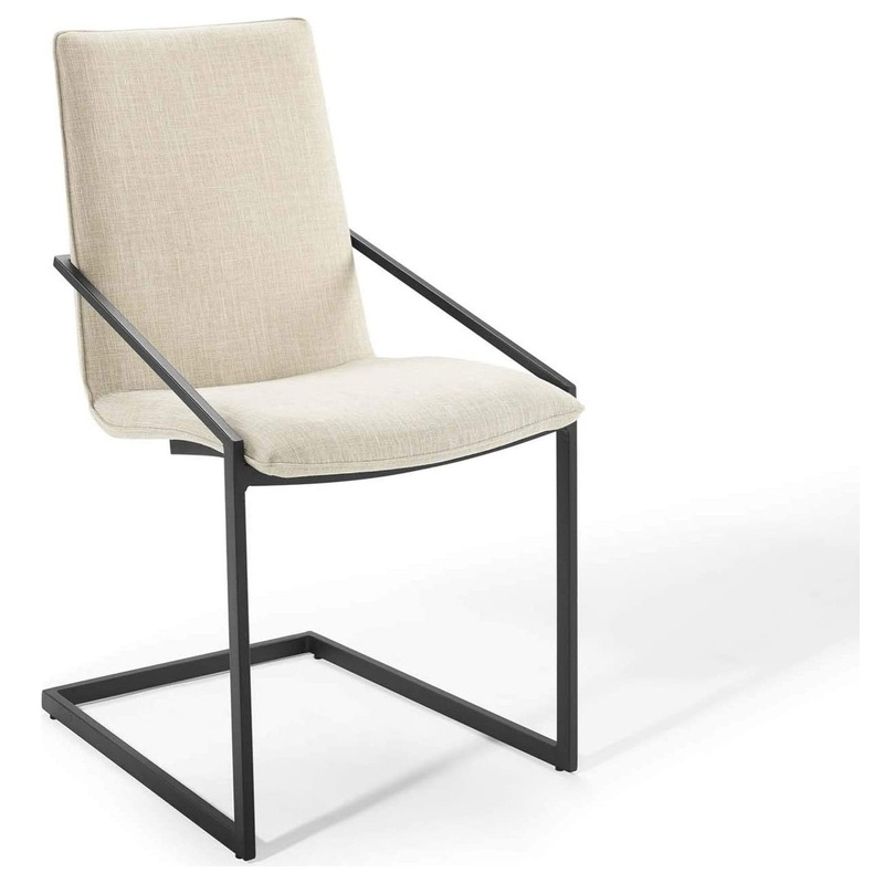 -Freely flowing angles form the understated elegance of the Fabric Upholstered Dining Armchair. -The Dining Chair has a matte black stainless steel frame, and a foam padded plywood seat. -Covered in durable and soft upholstered fabric, the Accent Chair emb