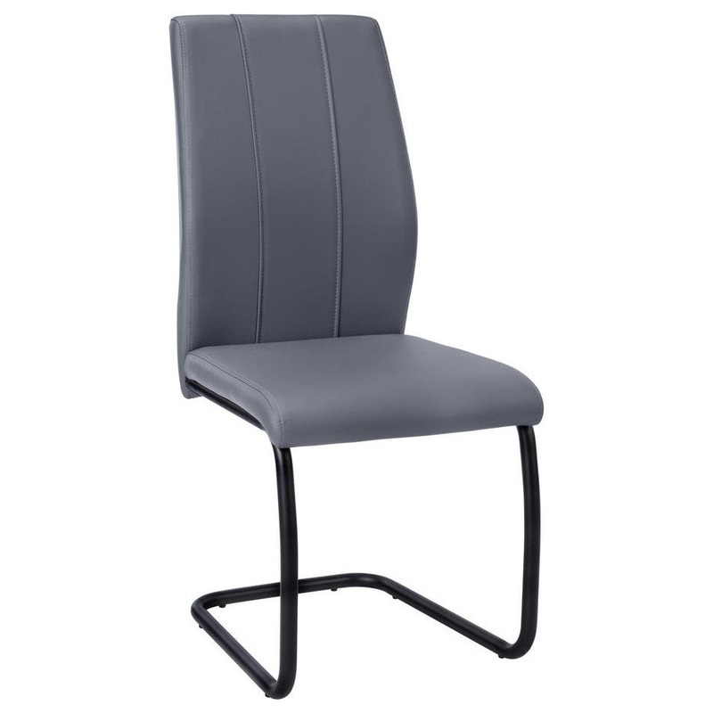 Show off these two up-to-the-minute kitchen chairs with confidence. They are made of a smooth upholstered grey leather look material with sturdy luxurious black metal bases in a U shape. Enjoy the enhanced comfy seat that will make a statement in your smal