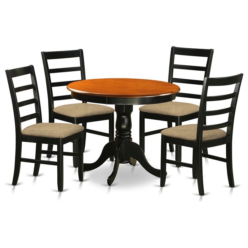 -Our Dining Table Set features comfortable Linen Upholstery seat and Pedestal legs, the structure of these wooden dining chairs and the stunning round wooden dining table is made from premium quality Black Finish wood, which creates the best quality color Combination to give a luxurious gaze to your kitchen.