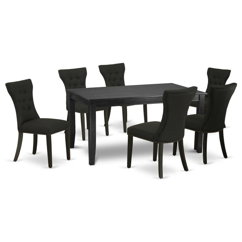 EAST WEST FURNITURE 7-PC DINNING ROOM TABLE SET 6 STUNNING PARSON DINING CHAIRS AND RECTANGULAR DINING TABLEOur dinette set includes 6 awesome Padded Parson Chairs and a great 4 legs dining room table. The modern small dining table set gives a Black solid wood rectangle table and frame and an awesome Black dining room chairs seat and high back that bring magnificence to your dining area and improve the charm of your awesome dining area. The superior quality of our amazing chairs helps our wonderful customers to get relaxation and feel free when getting their meal. This dinette table crafted from top-quality rubber wood which can bear the weight of 300 Lbs. Our parson chairs have a wooden frame with a luxury seat of superior quality foam which is covered with Linen Fabric that gives you relaxation with family or friends. This listing has a premium color of Black finish for wood table and Black finish upholstered dining chairs. Our lovely premium colors boost the beauty of your living area and provide a high-class glance to your dining room or dining area. East West Furniture usually created from modern furniture along with easy assembling parts. We try to keep our furniture parts modern as well as simple. Our high-class kitchen table set is best for your gorgeous dining room as well as the kitchen. You can use it for casual home parties. Keep enjoying East West modern furniture!Features:Wood Dining Table Dimension: Length 60; Width 36; Height 30.Wood Color: BlackFabric: Linen FabricParson Chairs Dimension: Length 19; Width 25; Height 41.Fabric Color: BlackPackage Include: 6 Beautiful upholstered dining chairs and A Gorgeous small rectangular table.