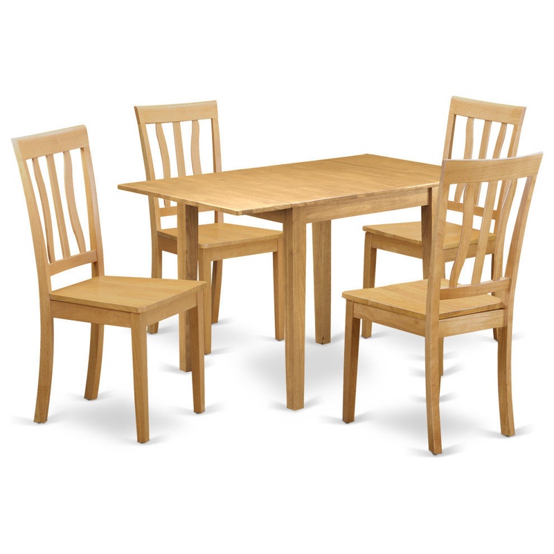 Provide a luxurious elegance to your dining room with our fantastic dining room table set 5 Pieces. This dining room table set gives 4 outstanding wooden dining chairs and an attractive breakfast table. The leading-edge slatted back design of these kitchen chairs will enhance the charm of any dining room. Comfortable Oak solid wood slatted back of these wooden dining chairs will give great support to your back. The frame of these creative wood chairs and two 9-inch drop leaves wooden dining table is made of Prime Quality Asian Hardwood (Rubber Wood) which provides fantastic robustness and stability to these dining chairs and kitchen table. The comfortable seat of these fabulous chairs for the dining room is created from Superior Quality Asian Oak color wood, which gives a magnificent glance and comfortable sitting experience. Fresh robust solid wood structure, comfortable wooden seat and slatted back, dependable wooden dining room table provide modernized appearance to your dining room, fantastic stability to this awesome dining room table set, and comfortable support to your back. Because of the amazingly perfect size, this modern dining table set is quite simple to carry, clean, assemble and change its places, Endless styles of this special dinner table fits perfectly with any decoration and a smooth wooden seat and back of these wood chairs will keep users comfortable.