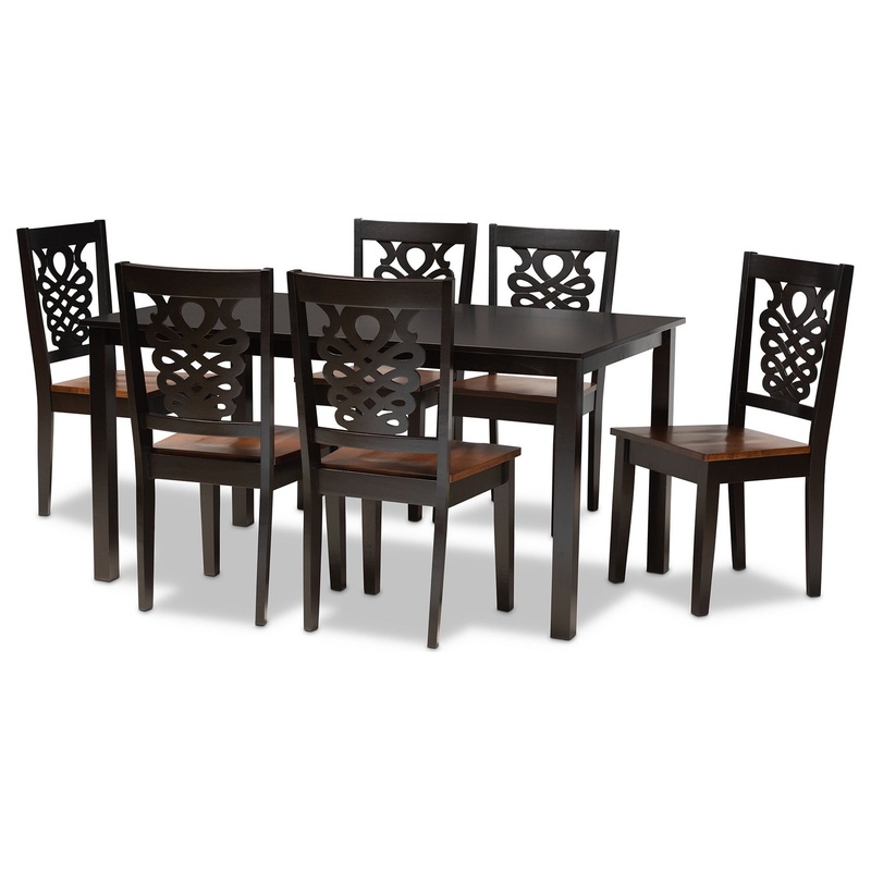 -This wooden set includes six chairs and one table showcasing a rich dark brown finish. -Each chair features a stunning geometric cut out design on its backrest for added visual appeal, while a walnut brown finished wood scoop seat lends casual comfort. -R