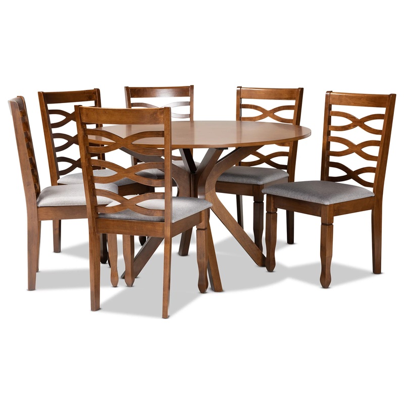 -Constructed from wood in a walnut brown finish and includes one circular table and six chairs, each upholstered in a light fabric that complements the warm wood finish.