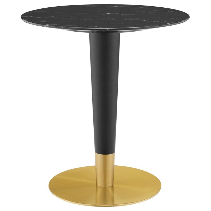 Gather family and friends for good food and conversation around the Zinque Dining Table. Bringing modern influence and mid-century inspiration to your dining space, this pedestal table reflects an organic shape. Perfect for entertaining or everyday dining, this dining table rests on a black and polished gold tapered base and features a 28″ artificial marble tabletop with an easy-to-clean coating. Non-marking ring to protect flooring. Assembly required.