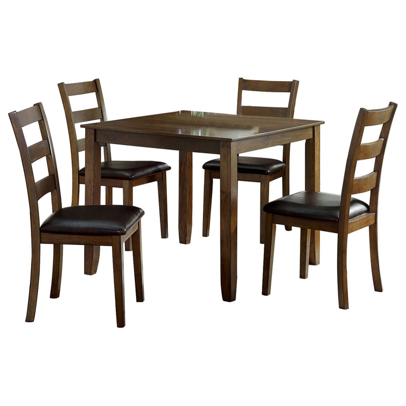 This traditional dining table set consists of a solid wood square table and four chairs. This set is made of rich walnut wood to deepen and enhance its matching wood grain pattern. The chair is designed with a curved wooden ladder backrest, and the comfortable square table top can effectively use the limited space. What a very practical dining set!