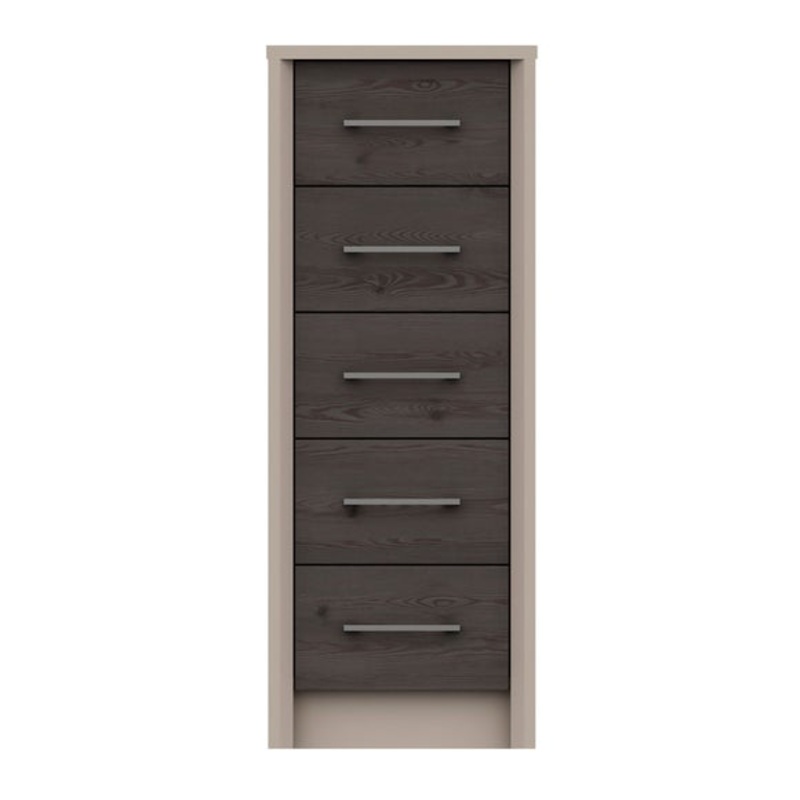 Crafted with a coloured carcass with complementing oak effect drawer fronts, the Dolan 5 Tall Chest of Drawers would make a stylish addition to any bedroom. This modern chest of drawers features five spacious drawers complete with stylish brushed pewter finished slim handles, linen-look drawer insides, 8mm heavy duty bases and easy glide runners for ease of use.