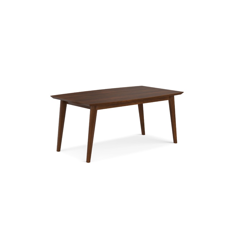 # Supporting the tabletop are robust, solid rubberwood legs that are angled and tapered with a rounded-square shape, and an inset table apron that adds a refined touch.