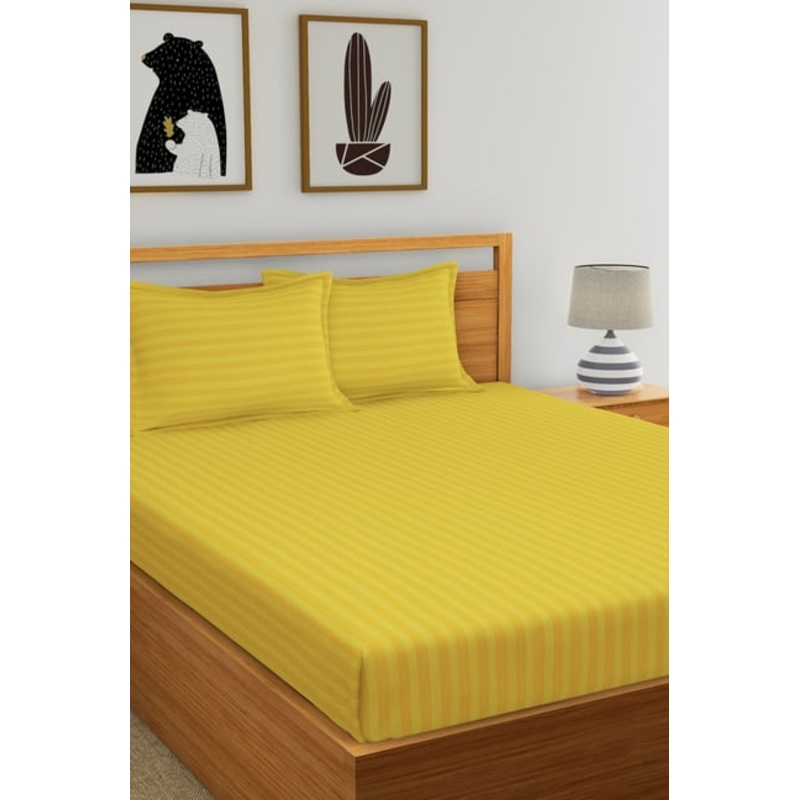 Renew your bedding collection with this golden bed sheet set from Dreamscape. The set comprises 1 double bed sheet and 2 pillow covers. The striped pattern enhances its appeal. Crafted from 100 percent cotton, it has a sateen finish. With a thread count of