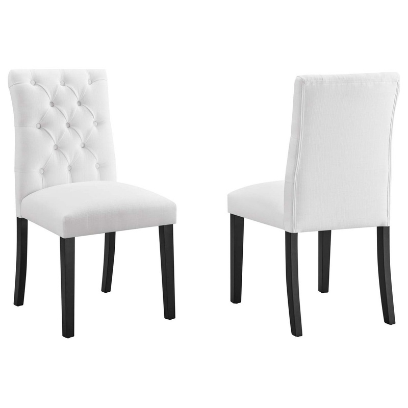 Bestow elegance with the Duchess Dining Chair. Chic and luxurious, Duchess features a stylish curvy form, richly tufted button back, dense foam padding, fine fabric upholstery, and wood legs topped with non-marking foot caps. Resonate grace and charm with a dining chair perfect for the modern home.