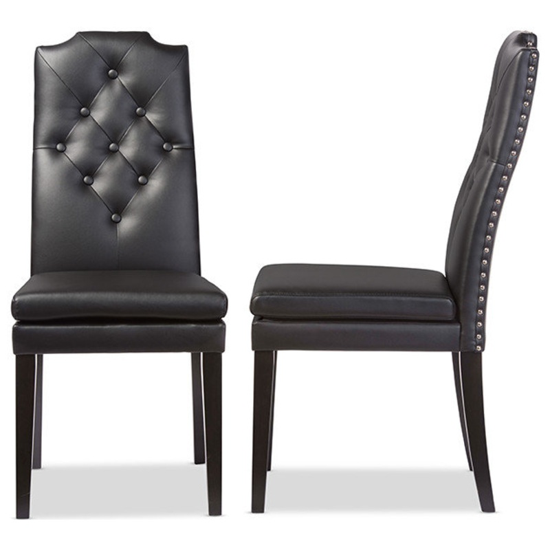 Elegant silhouette and luxurious appeal echo in the Dylin Modern and Contemporary Dining Chair. Upholstered in quality faux leather finished in black, the chair features delicate silver nail heads garnishing the edges. The backrest of the side chair presen