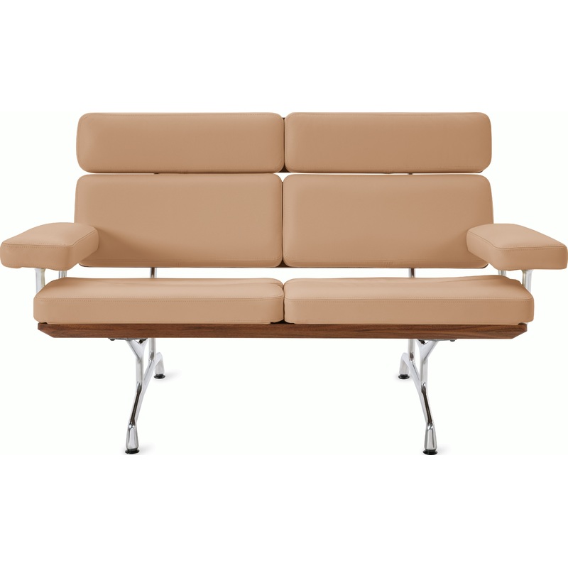 Charles and Ray Eames designed the Eames Sofa (1967) to complement their Soft Pad Collection, showing off a harmonious blend of wood, leather, and polished aluminum. This two- or three-seat modern couch is equally fit for home or office, with carefully considered details.The sofa features a solid wood back and frame panels finished with gunstock oil, polished aluminum legs and arm supports, and plush foam cushions upholstered in leather. Cushion undersides are covered in nylon for good ventilation and supported by resilient webbing for added comfort. The Eames Sofa was the last piece of furniture produced by the Eames Office and has been in production since 1984. This is an authentic Eames product by Herman Miller.