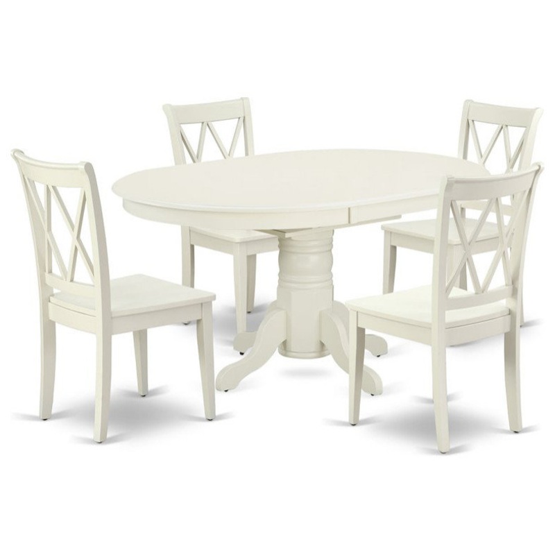 The AVCL5-LWH-W kitchen dinette set brings an affectionate family feeling in the kitchen space. A comfy and luxurious Linen White color offers any dining area a relaxing and friendly feel with the medium dinette table. The Oval Shaped table features a pedestal base that will furnish your dining area with a sophisticated look. With a soft rounded bevel at the edge of the table top, this well-designed and comfortable kitchen table may be used for hours at a time. This spectacular slick kitchen table makes a really good addition for all kitchen space and corresponds all sorts of dining-room concepts. Slender Double X back kitchen chairs finished in rich Linen White color with wood seats present fashionable and cozy seating. Made up of hardwood, the chair is stable and offers a sturdy finish. The chairs add elegance and class to any place you have placed them. The frame of the chairs are engineered to offer a great amount of comfort to your spine and thus reduce the chances of back pain. The matching color of the chair with the table brings a good contrast in the kitchen area. The standard shape, size and design makes the dining area significantly attractive. This contemporary, budget friendly, durable and comfortable dining set can be good choice if you are looking for a great dining time experience with your family or friends.