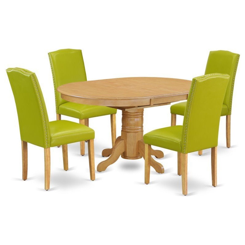-The dining set has an oak solid wood small dining table and body and a gorgeous autumn green PU leather parsons dining chairs seat and high back that deliver elegance to your dining-room and boost the beauty of your excellent dining room