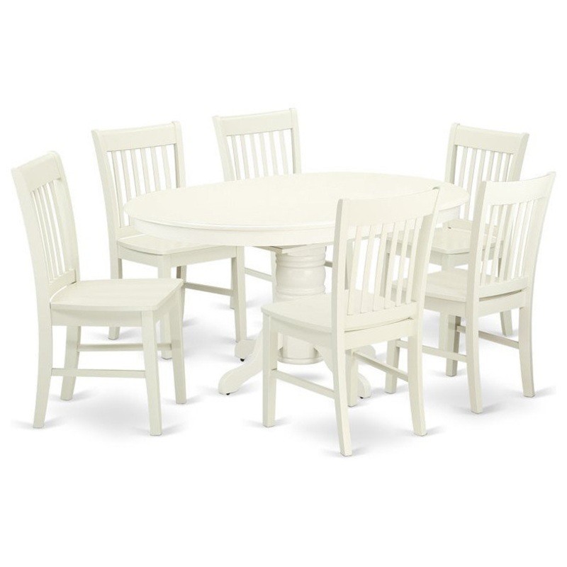 Give your room decor a new and polished look with this modern 7 Piece Dining Set. Available in a marvelous Linen White finish, you can easily incorporate this set into virtually any setting. Made from solid rubberwood, this charming set includes a clean-lined round-oval table with a single solid pedestal base, and six classic side chairs with sturdy wood seats. Maximum support and stability is offered by the pedestal styled base of this 7-piece dining set. It can be cleaned with a damp cloth.