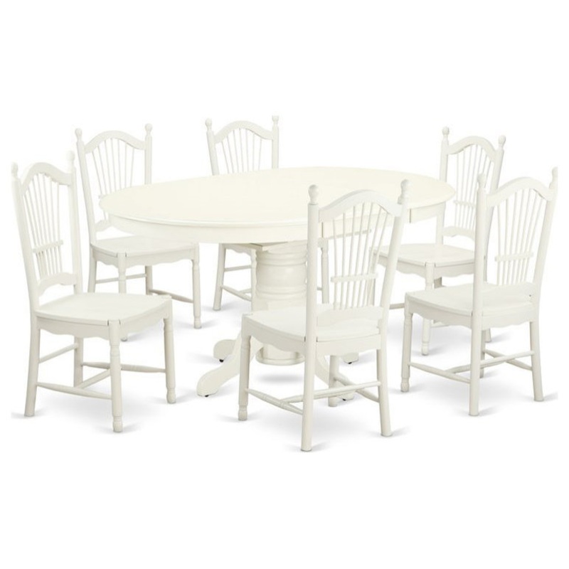 This particular Linen White oval kitchen dining table set can contribute that special impression for dining room elegance to both traditional and fashionable decorating. Give your room decor a new and polished look with this modern 7 Piece Dining Set. Available in a marvelous Linen White finish, you can easily incorporate this set into virtually any setting. Made from solid rubberwood, this charming set includes a clean-lined round-oval table with a single solid pedestal base, and six traditional styled side chairs with sturdy wood seats. Maximum support and stability is offered by the pedestal styled base of this 7-piece dining set. It can be cleaned with a damp cloth.