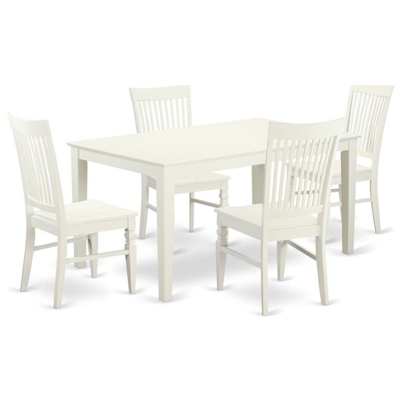 Pairing elements from modern and traditional styles, this five-piece dining set brings visual appeal and versatile flair to your well-appointed home. It consists of four chairs and one dining table all in a single Linen White finish. The table’s 4 straight leg support brings a simple and breezy style to any space, making it incredibly easy to incorporate into any dining room. The set’s four multi-slatted back chairs are perfect for seating guests at your next neighborhood pot luck or weekend family dinner. Made with Rubberwood, this set is strong, sturdy, and long lasting.