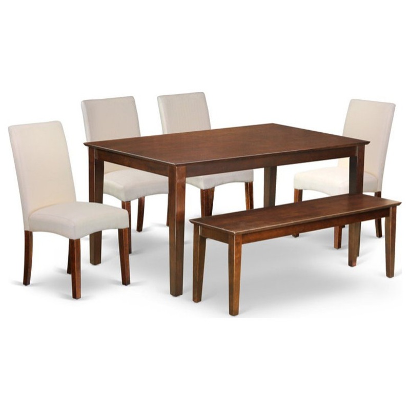 The CADR6-MAH-1 dining set provides a distinctive, smooth Mahogany finish well-fitted to your dining room. The fresh and clean lines dominate the cutting-edge design of the rectangular table. This standard table can fit 4 to 6 persons easily. This amazing kitchen table makes a really good addition for all kitchen space and corresponds all sorts of dining-room concepts. The wooden table is created from prime quality rubber wood known as Asian Hardwood. No heat treated pressured wood like MDF, particle board or veneer top fabricated. Transform your dining room into an elegant space with these high back side chairs. From head to toe these chairs embodies refinement with its classic design. The high back features a gentle curved crown crest. The soft fabric in a neutral palette makes these chairs a great fit for any dining room. The frames are made of high-quality wood that makes the chairs very durable and stable. The chairs are engineered to offer a great amount of comfort to your spine and thus reduce the chances of back pain. The standard shape, size and design makes the dining area significantly attractive. Mahogany finish bench matches well with both the table and the chairs. This contemporary, budget friendly, durable and comfortable dining set can be good choice if you are looking for a great dining time experience with family and friends.
