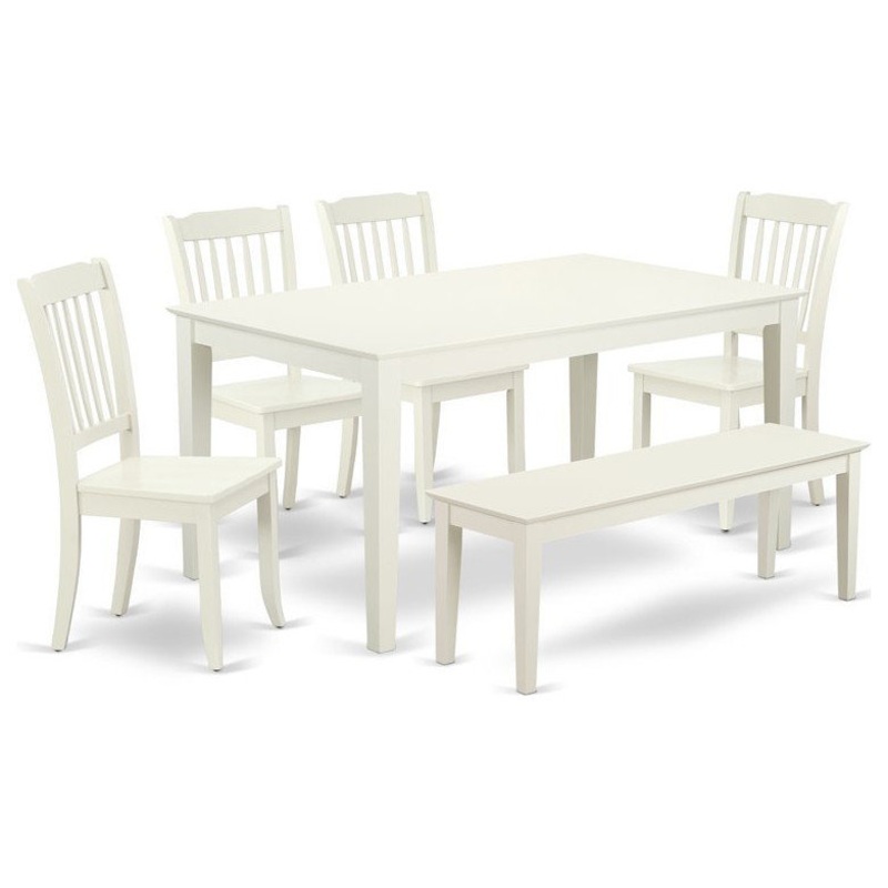 The CADA6-LWH-W dining set provides a distinct, sleek Linen White finish well-fitted to your dining room. The fresh and clean lines dominate the cutting-edge design of the rectangular table. This kitchen set provides you with subtle and cleanly made dining chairs made out of solid wood with a matching Linen White finish. This standard table can fit 4 to 8 persons easily. The eye-catching Danbury dining room chair finished in elegant Buttermilk and Cherry offers a modern look in your dinette space. The Kitchen dining chairs come with a solid wood seat to fit personal preference and perfect design. The Stylish dining chair features curved front legs. The 7 vertical slats give any dining area a touch of class and sophistication. Made up of hardwood, the chair is stable and offers a sturdy finish. The chairs add elegance and class to any place you have placed them. The frame of the chairs are engineered to offer a great amount of comfort to your spine and thus reduce the chances of back pain. The matching color of the chair with the table brings a good contrast in the kitchen area. Linen White finish bench matches well with both the table and the chairs. The standard shape, size and design makes the dining area significantly attractive. This contemporary, budget friendly, durable and comfortable dining set can be good choice if you are looking for a great dining time experience with your family or friends.