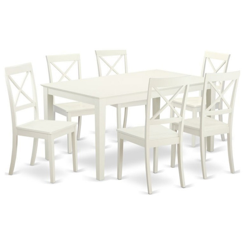 By pairing elements from modern and traditional styles, this seven-piece dining set brings visual appeal and versatile flair to your well-appointed home. It consists of six chairs and one dining table all in a single Linen White finish. The table’s 4 straight leg support brings a simple and breezy style to any space, making it incredibly easy to incorporate into any dining room. The set’s six cross back chairs are perfect for seating guests at your next neighborhood pot luck or weekend family dinner. Made with Rubberwood, this set is strong, sturdy, and long lasting.