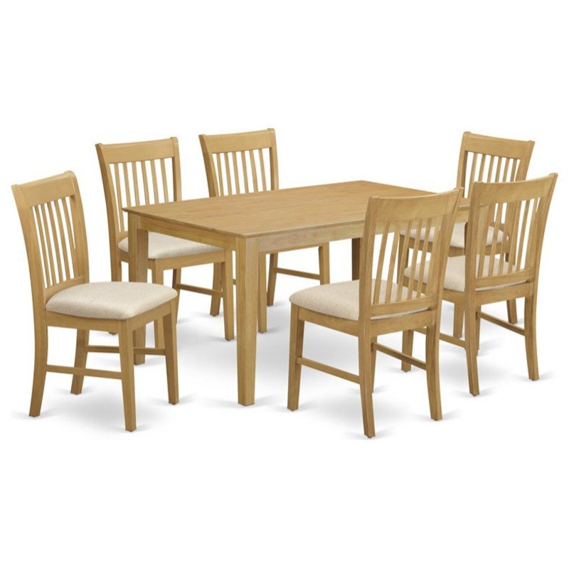 -Mid-century dining table set supply linen fabric dining room chairs seat with elegant oak finish legs and oak finish dining room table