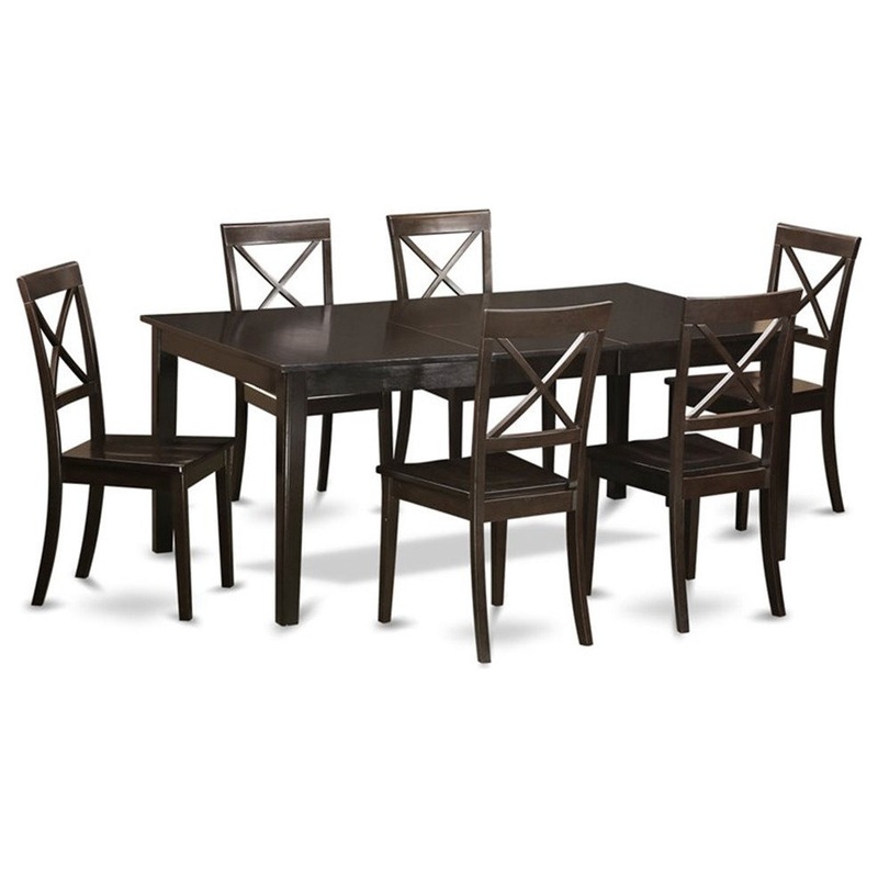 -This self-storing butterfly leaf dining room table set features comfortable cappuccino solid wood seat, cappuccino solid wood legs, and open x-back on each dining room chair