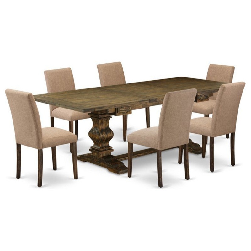 Take your kitchen or dining area to the next level with our sophisticated style rectangle expandable leaf table. The dining table features a classic design with a painted, fresh Distressed Jacobean finish for a simple, yet stylish mid-century dinette table. The dining table includes a 24-inch expansion leaf that can be easily expanded to provide additional space for extra food trays and drinks on certain occasions or great parties. Created from Asian tropical hardwood also known as rubberwood, this dining table set is strong and durable. This high-class dining table is ideal for your incredible dining room as well as the kitchen. Our rectangular dining table is an excellent complement to your home! Present your family and friends with the best seat in the house. The simple but charming Parsons chairs will add ambiance and style to any dining room. A contemporary twist on a classic design, this eye-catching design will liven up any look. The traditional parson gives this chair a touch of familiar charm, while the Light Sable color seat fabric with Distressed Jacobean frame finish and clean-lined design elevate this chair with a modern flair. Plush padding covered with a soft fabric seat offers comfort and the standard height back provides support for relaxing seating and thus reduce the chances of back pain. The sturdy construction of the hardwood frame and legs give this parson chairs stability and durability. Ready to give your dining room a new look? Just by switching out your chairs, you can effortlessly refresh your space. Try surrounding a sleek wood table in your dining room with these sleek chairs to craft a new aesthetic. This contemporary, budget friendly, durable and comfortable dining set furniture can be good choice if you are looking for a great dining time experience with family and friends.