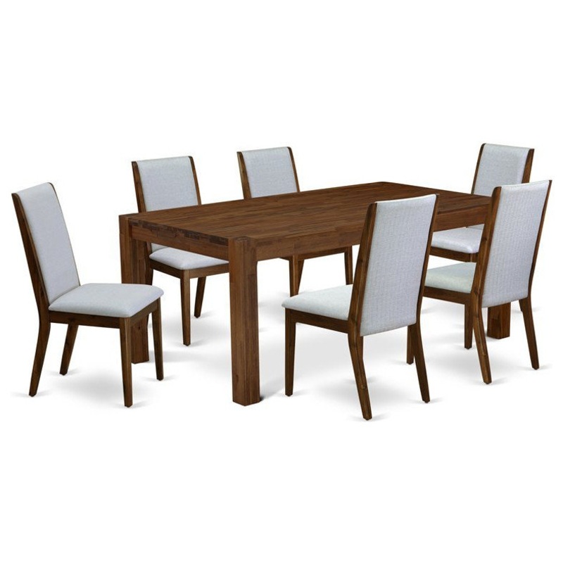 Our 7-pc kitchen room table set includes 6 parson dining chairs and 1 dining table. These dining room chairs have a Linen Fabric seat, Stylish Chair Back, and a wooden dining table that includes a rectangular top and Wooden 4 Legs. The upholstered dining c