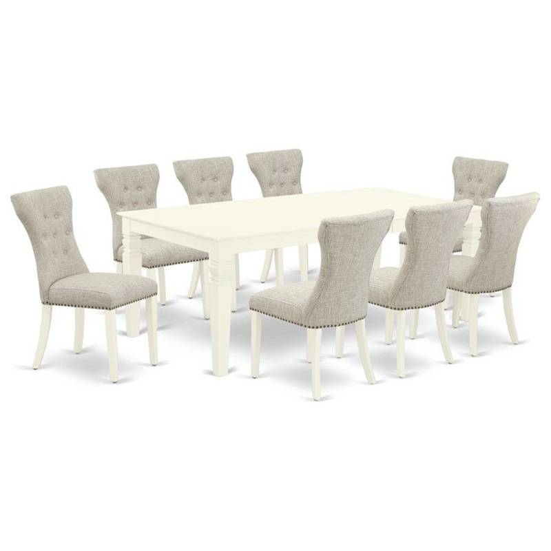 This rectangular dining table set includes 8 amazing upholstered dining chairs and a wonderful 4 legs small dining table. The modern kitchen dining table set delivers a Linen White solid wood kitchen table and body and a great Doeskin parson chairs seat an