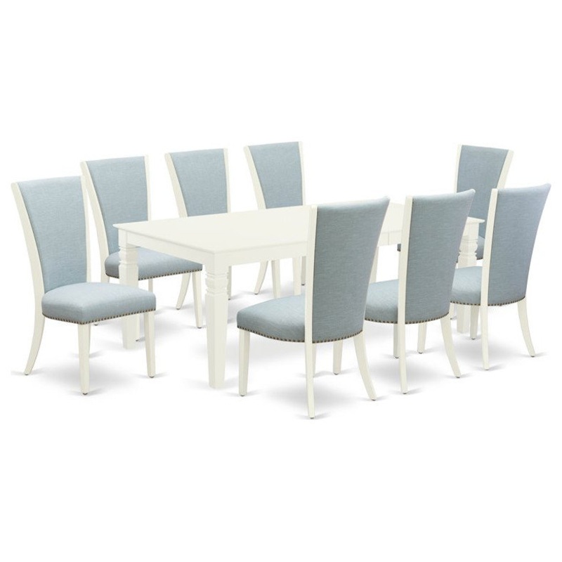 East West Furniture LGVE9-LWH-15 of 8-piece parson chairs with Linen Fabric Baby Blue color and an attractive two-side 18 butterfly leaf rectangle kitchen table with Linen White color. This outstanding two-side 18 butterfly leaf rectangle kitchen table can bring the remarkable impression of the dining style to both typical and trendy decoration. This modern dining table set will bring a wonderful dose of beauty to your dining-room. The attractive 9-piece classic wooden dining table set emphasizes its curves and details, giving an otherwise traditional set a little modern twist. The body of these unique kitchen chairs and two-side 18 butterfly leaf rectangle wooden table is created from Premium Quality Asian wood (Rubber Wood) which delivers fantastic sturdiness and stability to these dining room chairs and two-side 18 butterfly leaf rectangle wooden dining table. Modern sturdy solid wood structure, comfortable upholstered seat, and stylish back, reliable mid century dining table offer leading edge gaze to your kitchen, fantastic stability to this excellent modern dining table set, and comfy support to your back. Due to the lightweight, this dining set is a breeze to carry, clean, assemble and alter its places, classic styles of this special two-side 18 butterfly leaf rectangle dining table meet perfectly with any home decor and a smooth oak wooden seat and stylish back of these dining chairs will keep users comfortable.