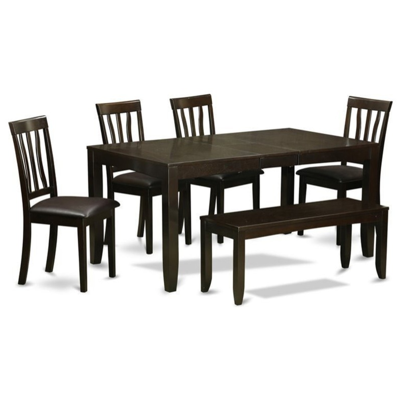 -This 6 piece dining set includes rectangular dining table and 4 faux leather dining room chairs and one bench finished in cappuccino