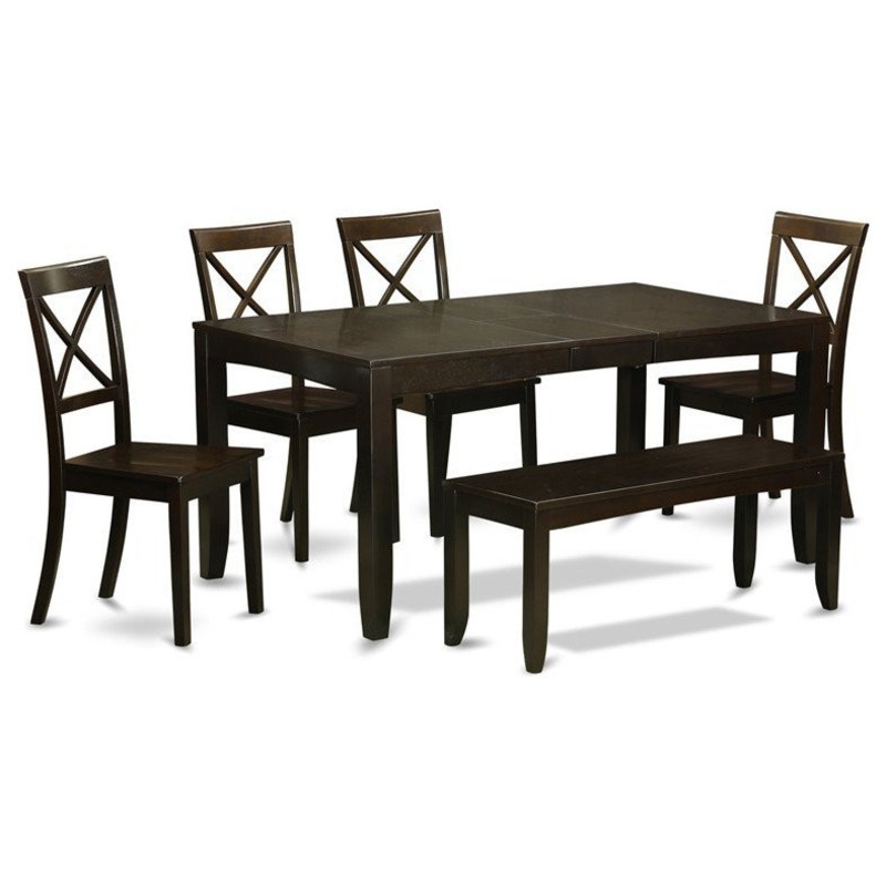 -This 6 piece dining set includes rectangular dining table and 4 wood seat dining room chairs and one bench finished in cappuccino