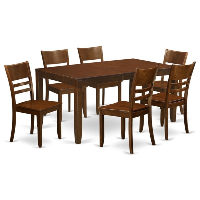 -This 7-piece dining set includes rectangular dining table and 6 wood seat dining room chairs finished in espresso